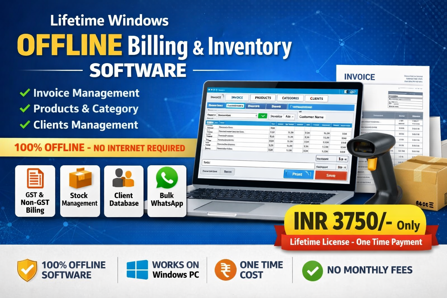 This software runs permanently on your Windows PC with no internet dependency, no monthly fees, and lifetime usage at an affordable one-time cost of INR 3,750/- only.